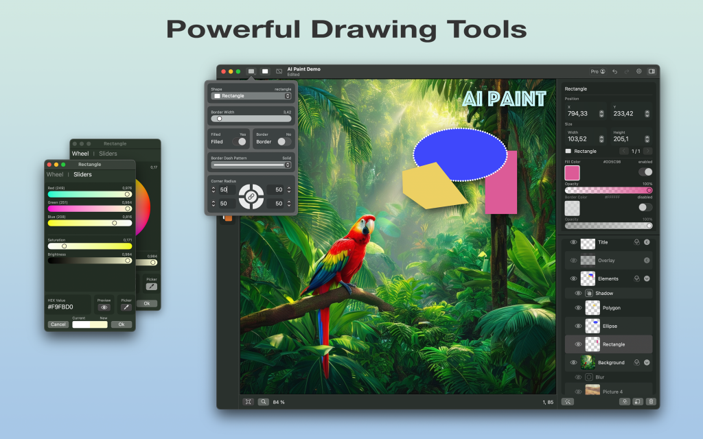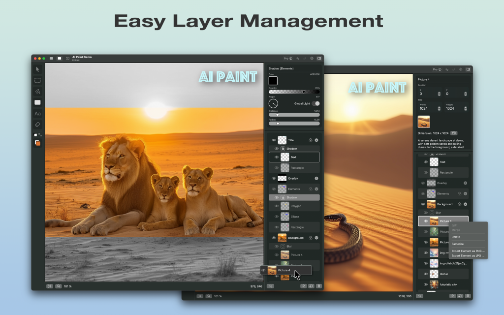 Enhance your layers with effects like shadow, blur, and saturation, adding depth and flair to your artwork.